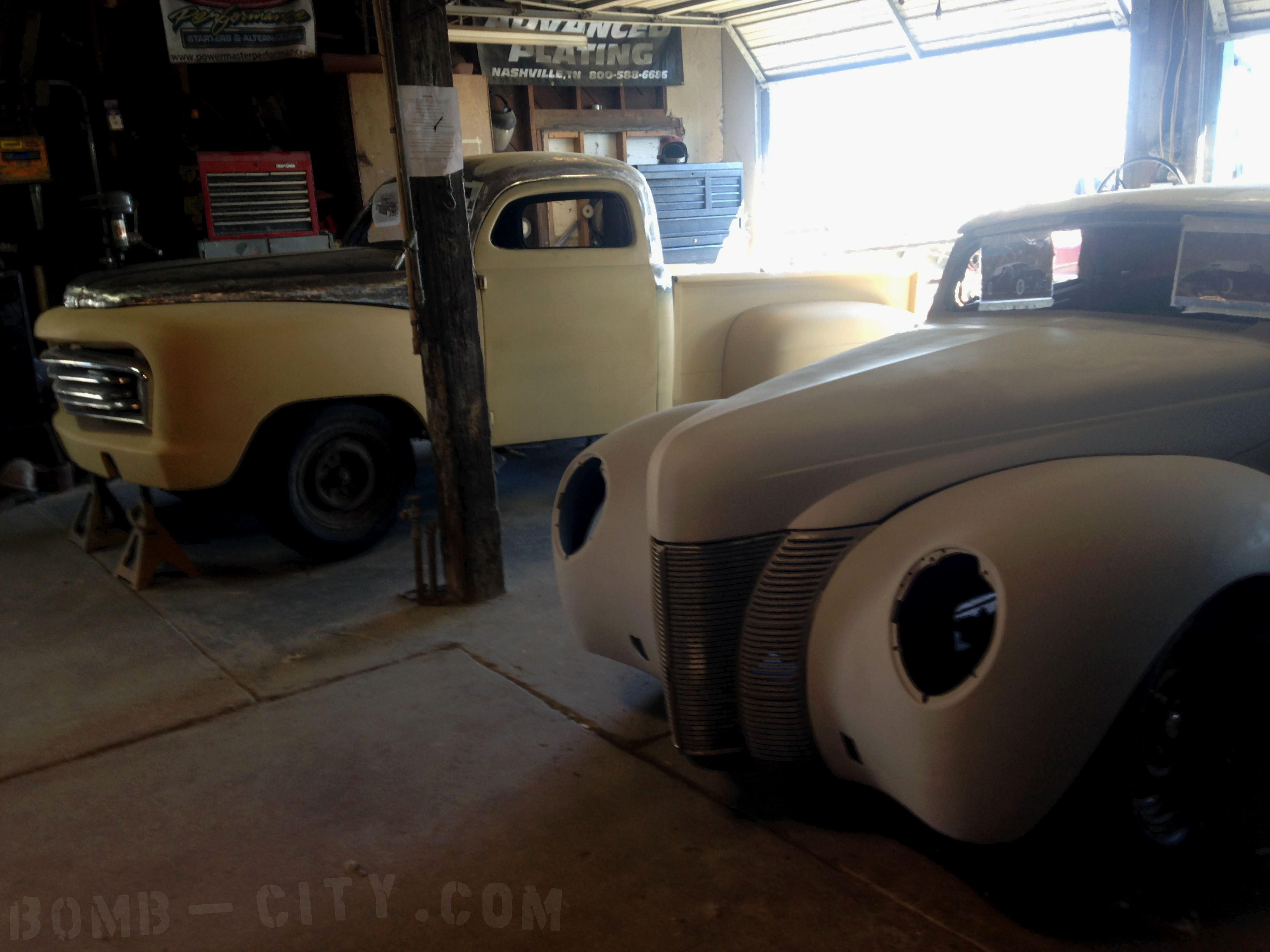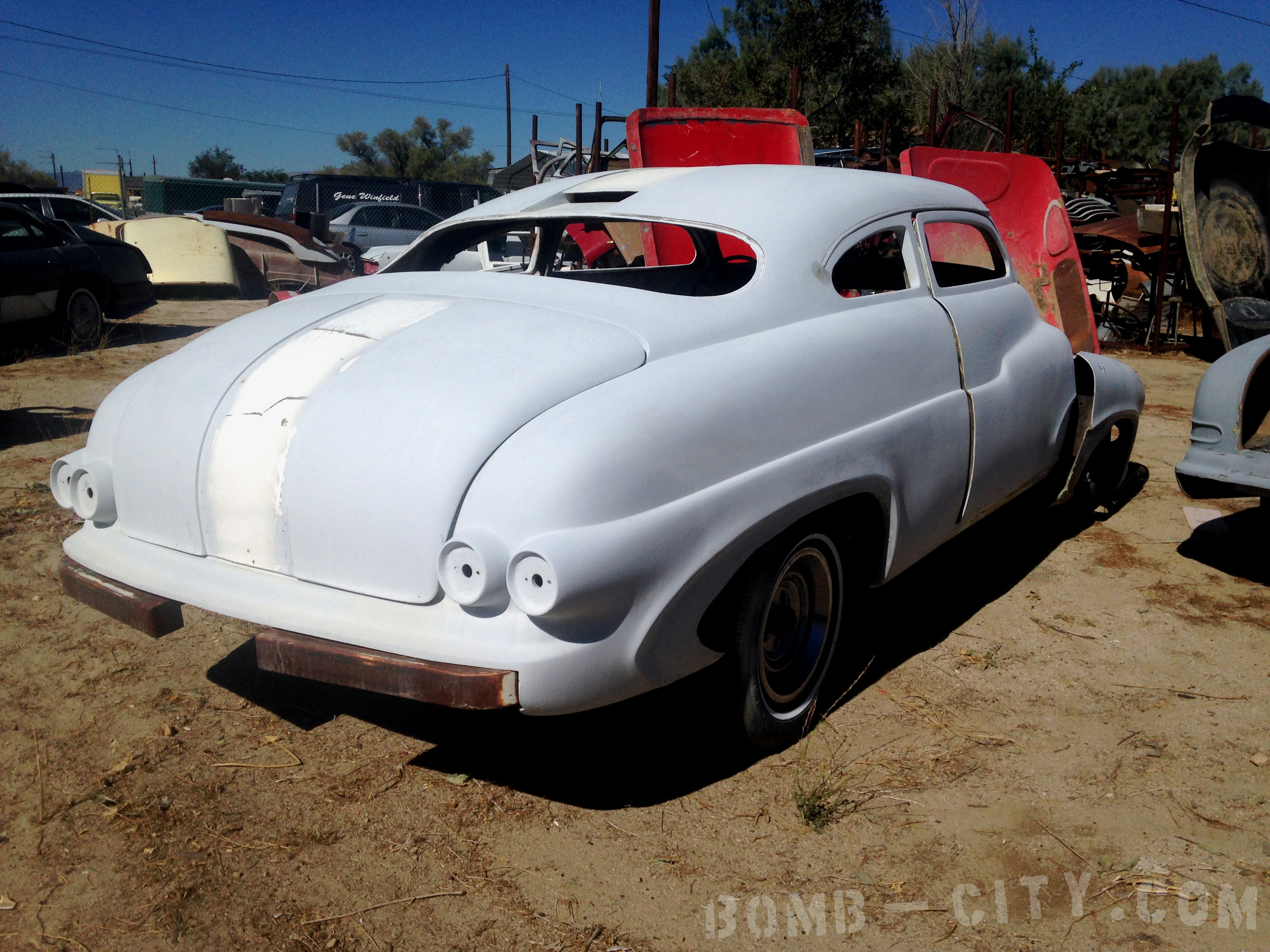 The back corner of Gene’s shop is stacked high with wild custom fiberglass Merc bodies, parts and molds.