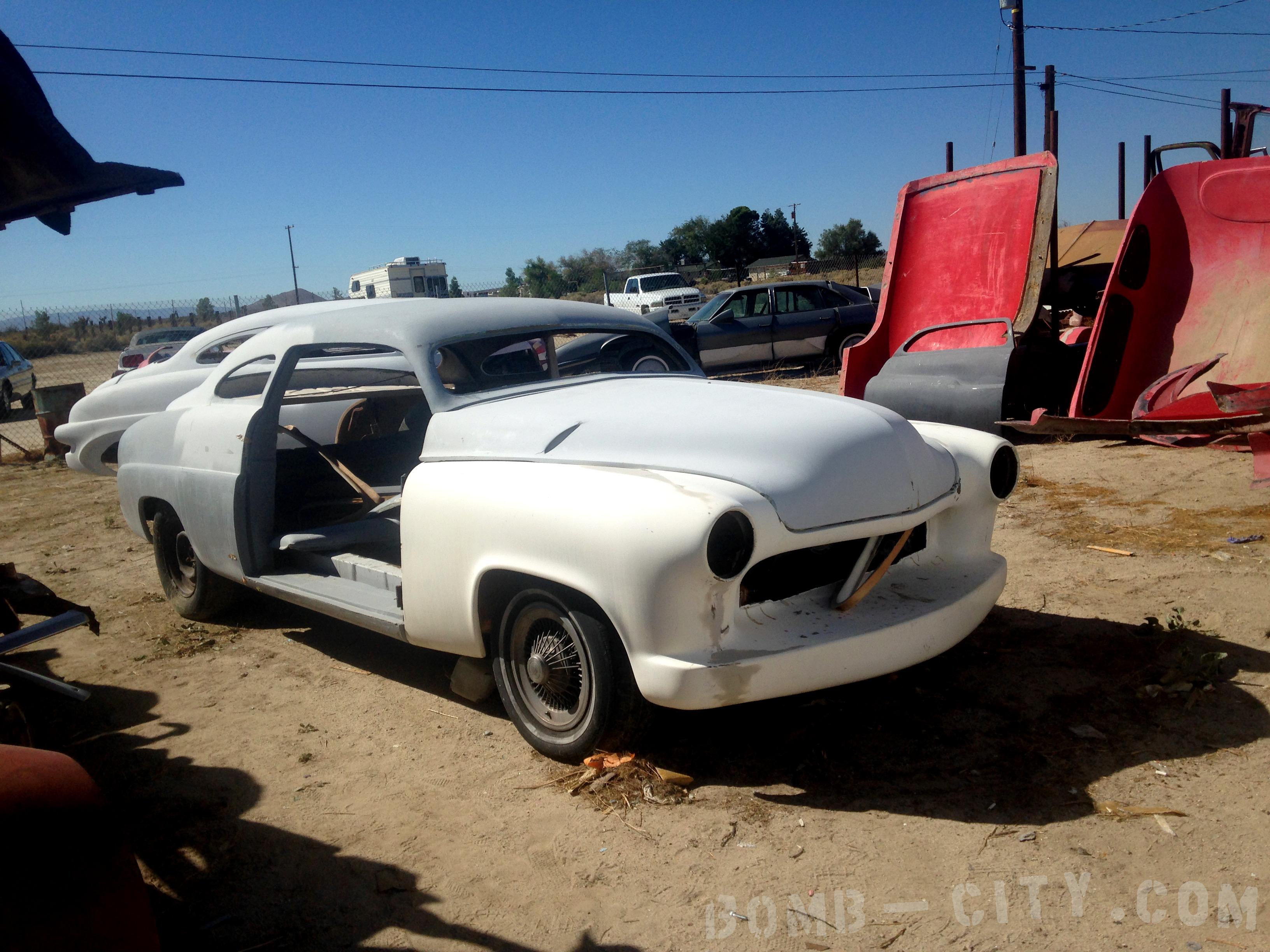 Winfield’s shop is not just a workshop on a small piece of land in the desert. It is an absolute custom car builder’s dream, a grown up playground overflowing with amazing cars and parts at every corner. This is sacred ground. Everywhere you look there’s something incredible, everywhere you look there’s something wild enough that even by itself were you to see it on the side of the road you’d pull over and spend a day gawking at it in disbelief. There are tons of amazing projects and parts cars in the back, racks of rare and obscure parts in the middle, and stacks of wild fiberglass parts and molds behind the shop. It is completely overwhelming; I could spend months crawling around and never really take it all in. To be honest between the heat and the overwhelming automotive menagerie I have no idea how long I stomped around, but it felt like I spent days there absorbing it all in what must have been mere minutes. Eventually we made our way through the scrap yard and stumbled through the show portion toward the front of the yard and found our way over to Winfield’s workshop to see the tools and place used to build his legendary customs.