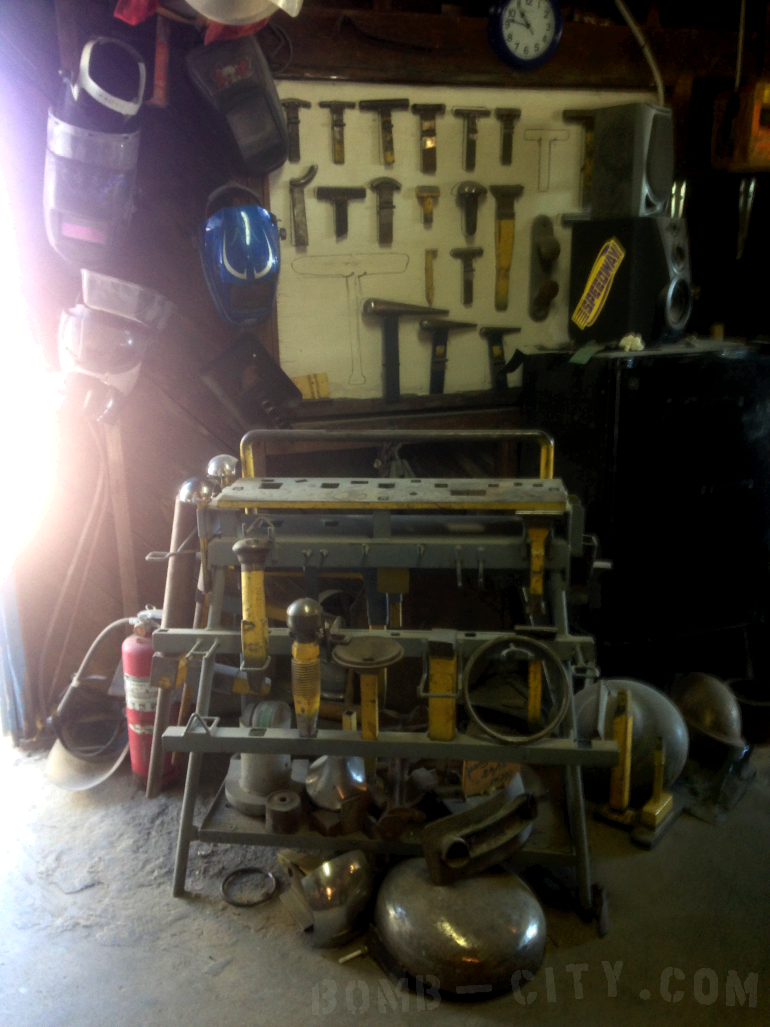 A wall of very specific tools, some home made, for shaping the wild customs that this shop was built for.