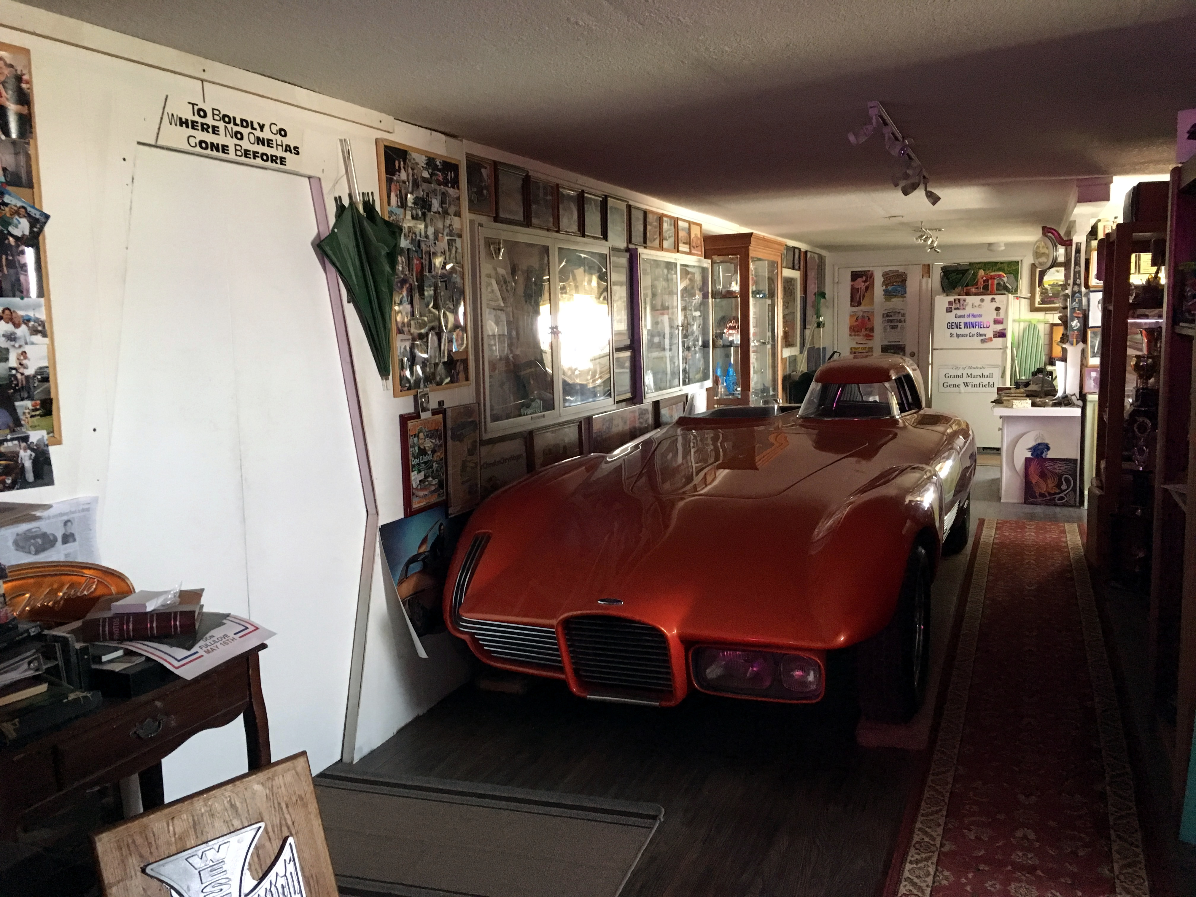 The rest of the day was absolutely mind blowing. I found Matchstick not only to be an extremely warm and welcoming person, but an incredibly driven and talented fabricator, a man of great taste in art and music, and a person of incredible esoteric knowledge of so many fascinating things, the three of us hit it off instantly. I’m happy that I was able to capture a small part of the conversation in the latest episode of the podcast, but it really only reflects a tiny portion of the great talks we had throughout the day. After a brief tour of his shop in Lancaster, Matchstick offered to take us through Gene Winfield’s shop in Mohave, which ended up being one of the single greatest experiences of my year. In the interest of brevity I’ll post the pictures from the tour below, as any detail in them by itself deserves a thousand words I’d never successfully recap explaining everything Matchstick shared with us that day. I would strongly urge anyone who’s made it this far to make it down to Winfield’s show in October, the shop, the museum, and the junkyard are really something that need to be seen in person. Looking at the pictures now I’m still blown away, but I still haven’t found an answer to a question that I blurted out in Gene’s kitchen standing next to the Strip Star. Is the fact that Gene Winfield, arguably the most important custom car builder alive today, lives in his own museum the most inspiring or the saddest thing I’ve ever seen? I don’t know. To me, this is sacred ground. I’d hold this place against the Smithsonian, there is so much history packed into those walls, so many incredible displays, trophies, and one-off creations that any section of the house alone would constitute a museum exhibit. The fact that Gene not only lives in this place himself, but that he also allows his workers and apprentices to stay there too and openly gives tours of it is Gene’s legacy. This is a man who came up from the humblest beginnings, building cars in a chicken coop on the side of the road in Modesto and rising to the top to be one of the kings of the show circuit. This was back when Hollywood & Detroit actually gave a shit about custom cars and put a great deal of press and money into promoting this world, so he would have had every right to be selfish, closed off, and hide his prized possessions recognized with admiration by the world behind velvet ropes and glass cases. In a culture where touching someone else’s car is unheard of, getting to brush by legendary cars like the Strip Star on your way to visit the Star Trek themed guest room should be unheard of, but it’s not. Gene is, despite all his great accomplishments, just a man. Cars are just a combination of steel, fiberglass, or whatever other unspoken things went into the bodies of TV & Movie cars, and they’re just a thing that he does. If you want to see his shop, shake his hand, and chase lizards around the junkyard with the shop dog you’re welcome to it. For me, as a private person that rarely has people over to my house purely out of shyness, has never worked on one of my cars in any important capacity with another person, and has never even gotten around to hanging my college degree on the wall this was such a shocking thing to see. I will be forever grateful for Matchstick walking us through the shop, showing us where the magic happens, and letting us get such a great and personal insight into how things work at Winfield’s shop. In a way I’m almost glad that Gene was out of town when we were there because these visuals combined with his presence probably would have been too much and I don’t know if I could have kept my cool, even looking at the pictures I’m a bit overwhelmed that I was actually there.