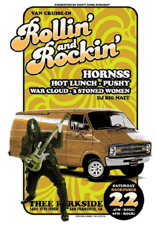 Below are some pictures I took at Rollin’ and Rocking at Thee Parkside a few weeks ago. This show was a lot of firsts for me, I’d never been to Thee Parkside before, which is something of an anomaly since I’ve been to nearly every other venue in the Bay, so it was great to finally see the stage that I’d always historically passed on seeing some great bands on. That much is definitely my mistake, Thee Parkside (good lord, it frustrates me more and more every time I type out that vestigial “e”. Were we confusing this with another Parkside? Did this fix it? Anyways…) was a great venue in a surprisingly chill part of the City, I have a feeling we’ll be back to this place again soon. Another first for me was, perhaps also surprisingly, this was my first “van show”. Sure, I’ve seen vans at car shows before, but this was something different, a place where the oddball vanner life accessories and aesthetic is cherished, a show where people have nicknames, a show that starts late, people park wherever, and the show goes on “until it’s over”. Based solely on my now one experience with van shows they seem to be on a whole other level than your typical car show, and that much I really dug. No one seemed to be trying to prove much of anything, the crowd was chill, there was no urgency and it really had a freewheeling vibe that I’d hope comes from a flame carried across the country for decades from the vanners who started this movement so many years ago. It was neat, and completely not what I expected. It was great to see our friend and friend of the podcast Matchstick and Meredith out there, and I wish I could have spent more time chilling on the side of theeee Parksideeeee in San Francisco’s always perfect autumn weather watching the sun drop over the restless city but alas, the Gallery was calling across the Bay, so Josie and I made it short and ducked out early to go help get the show ready.